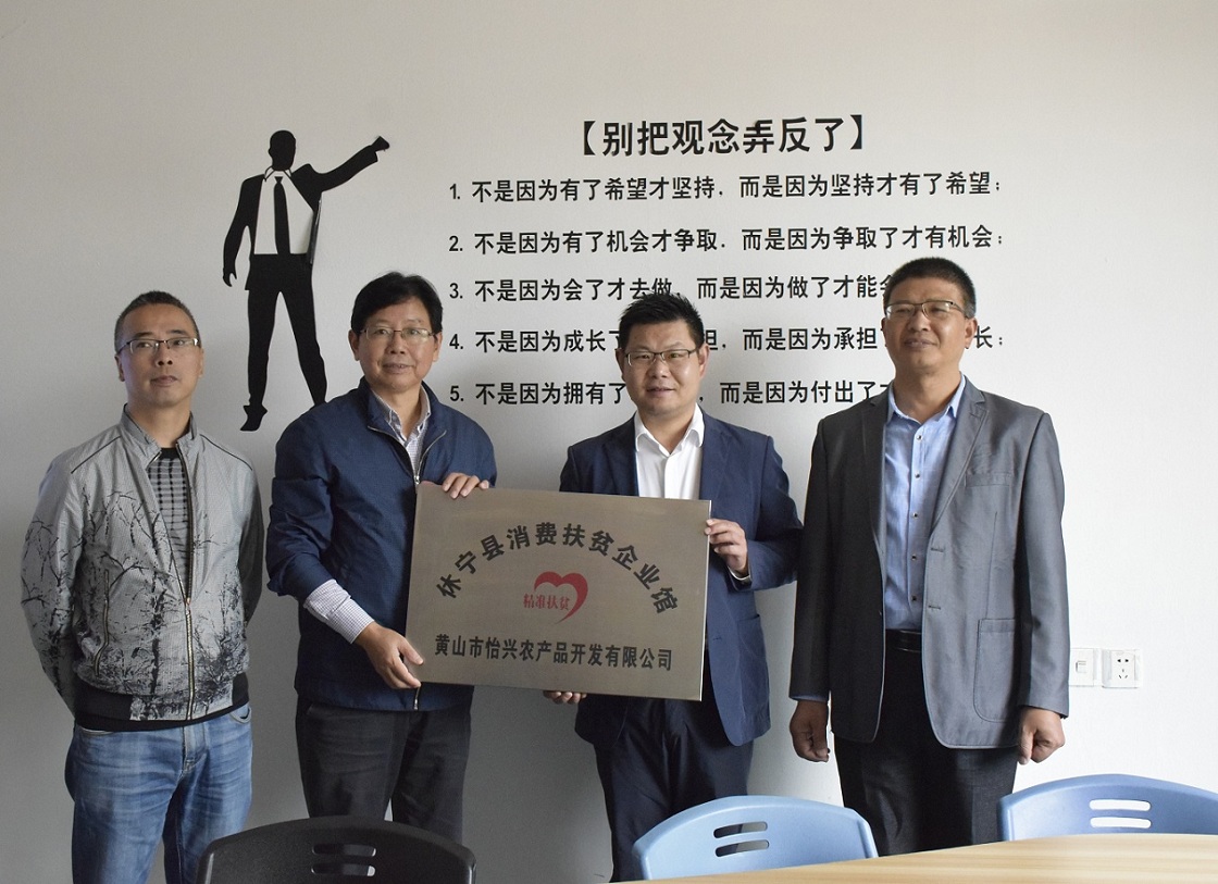 9月25日上午,縣發(fā)改委、縣經(jīng)信商務(wù)局、縣扶貧局等相關(guān)領(lǐng)導(dǎo),蒞臨怡興公司進行工作指導(dǎo),并在進行了授牌儀式,為公司頒發(fā)了“休寧縣消費扶貧企業(yè)館”。